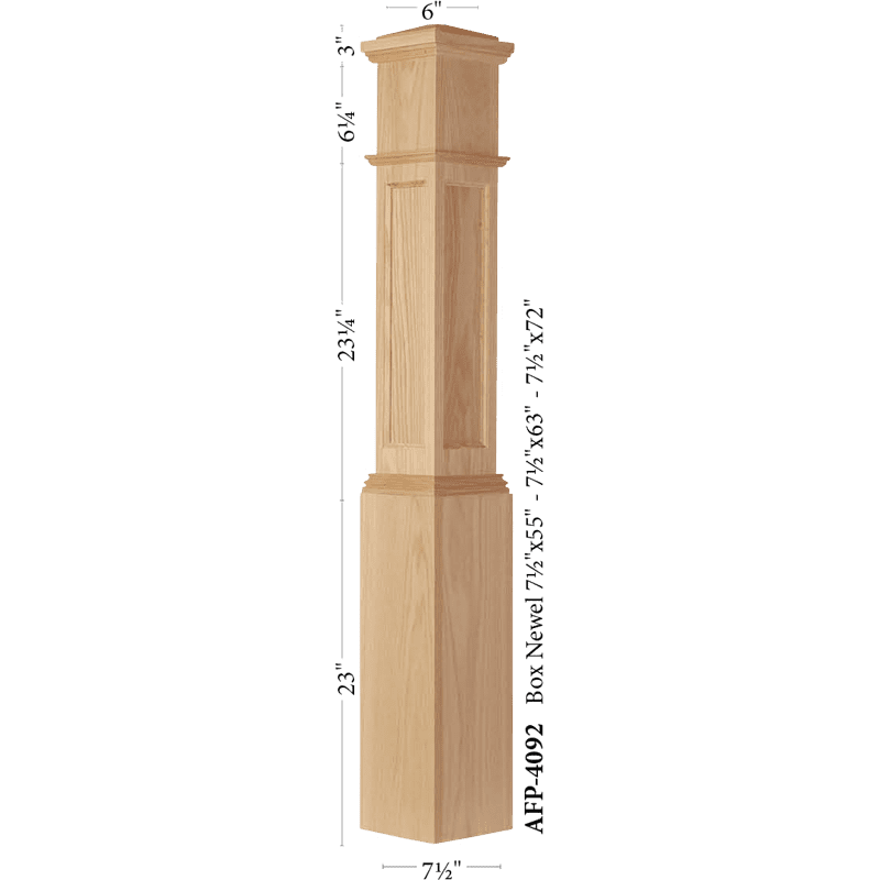The AFP4092 Box Newel is a traditional style box newel that is often referred to as the “Big Brother” to industry standard 4091 newel post. This is a classic newel post which features clean, straight lines and a stylized cap. The shaker door paneling in the shaft of the post adds a sophisticated ornate character to the post. Its hefty stature makes for a great starting newel to your staircase, or in some cases use throughout.