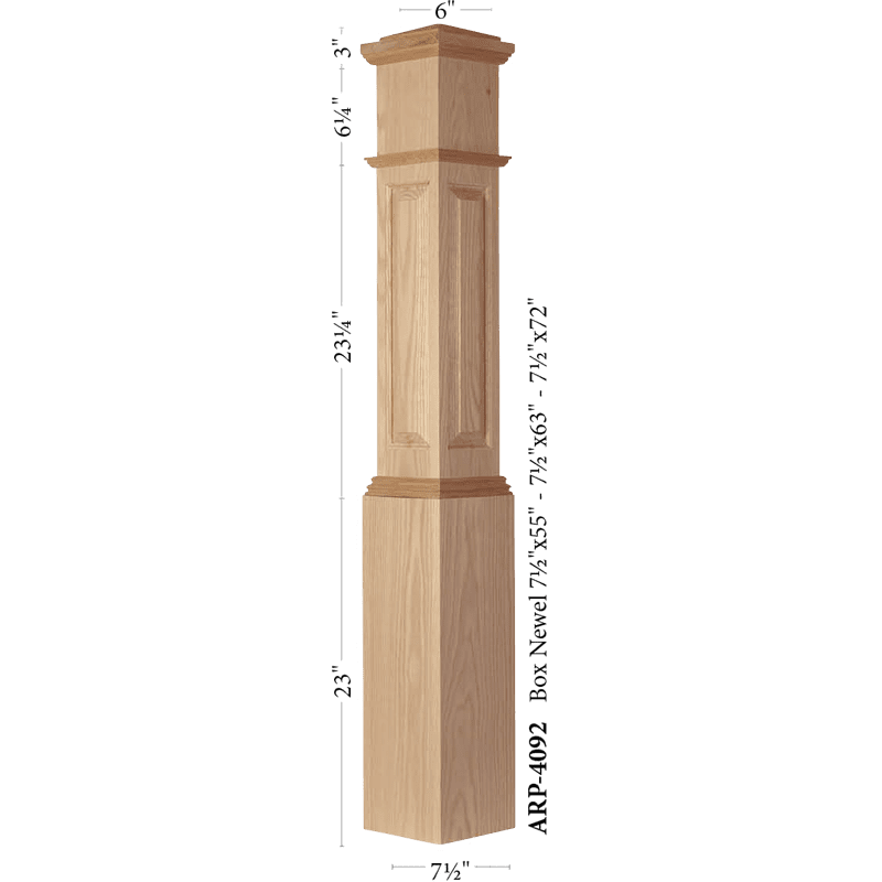 The ARP4092 Box Newel is a traditional style box newel that is often referred to as the “Big Brother” to industry standard 4091 newel post. This is a classic newel post which features clean, straight lines and a stylized cap. The raised shaker door paneling in the shaft of the post adds a sophisticated ornate character to the post. Its hefty stature makes for a great starting newel to your staircase, or in some cases use throughout.