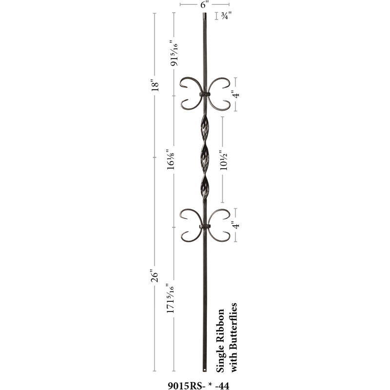 The 9015RS Single Ribbon with double butterflies baluster is a top selling staple in the stair and rail industry. As fads fade in and out our hollow iron baluster offers a timeless look of simplicity. The butterflies add a subtle but intricate style. The powder coated finish ensures a lifespan free of knicks, chips and dents. Light weight hollow construction makes for an easy and seamless installation. This baluster pairs with any ½” baluster shoe like the 9062 flat or 9063 angled shoes. Even a proper baluster replacement can do wonders for the style of your stairwell giving it a quaint but modern touch.