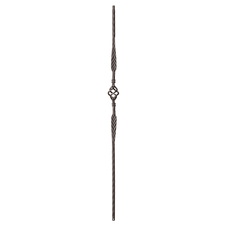 The 9023HE double Feather with single basket Hammered edge style bar baluster is a top selling staple in the stair and rail industry. The hammered appearance gives a rustic look to your railing system. As fads fade in and out our hollow iron baluster offers a timeless look of simplicity. The powder coated finish ensures a lifespan free of knicks, chips and dents. Light weight hollow construction makes for an easy and seamless installation. This baluster pairs with any 9/16” baluster shoe like the 9062 flat or 9063 angled shoes. Even a proper baluster replacement can do wonders for the style of your stairwell giving it a quaint but modern touch
