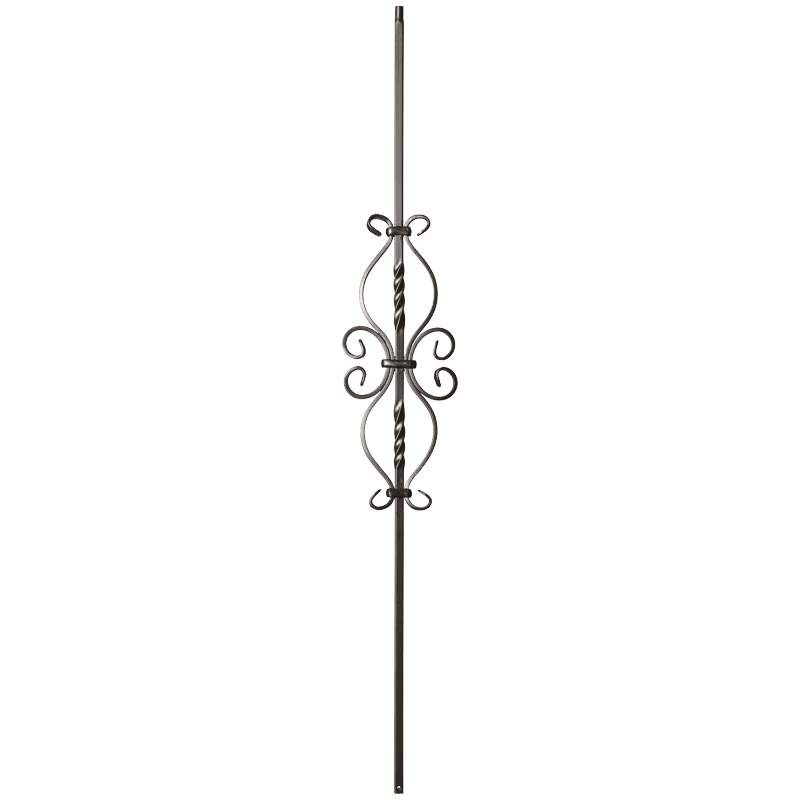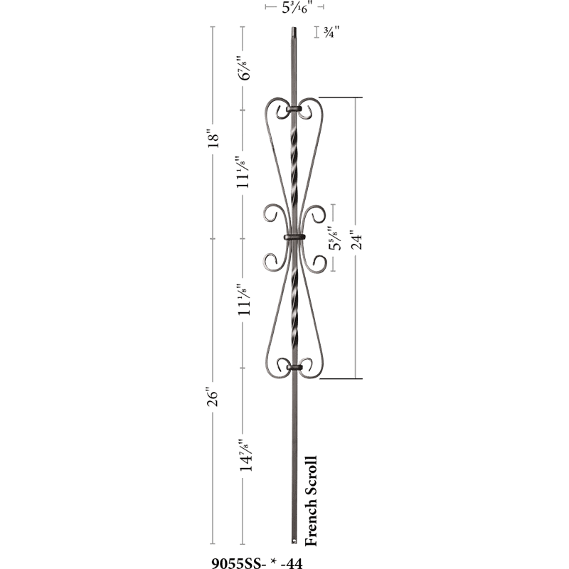 The 9055SS Scroll baluster is a top selling staple in the stair and rail industry. The 5-3/16” x 24” French scroll offers a dose of ornate quality to an otherwise simple railing system. As fads fade in and out our hollow iron baluster offers a timeless look of simplicity. The powder coated finish ensures a lifespan free of knicks, chips and dents. Light weight hollow construction makes for an easy and seamless installation. This baluster pairs with any ½” baluster shoe like the 9062 flat or 9063 angled shoes. Even a proper baluster replacement can do wonders for the style of your stairwell giving it a quaint but modern touch.