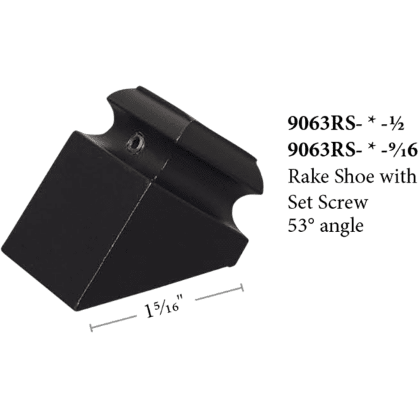 The 9063RSS_1/2 baluster shoe is a angled shoe used on surfaces with pitch. This will pair with any 1/2” baluster. The set screw add an extra measure of stability.